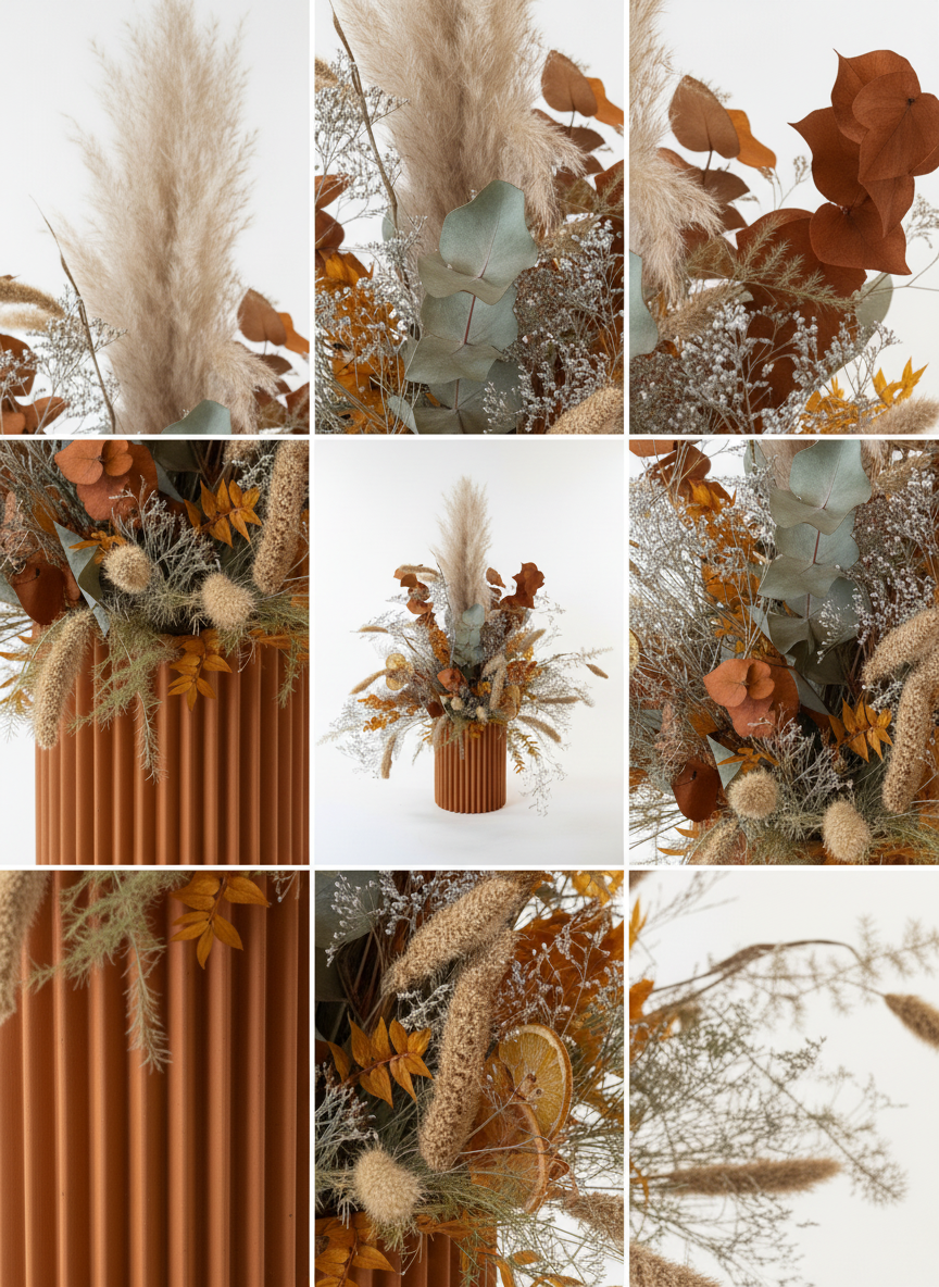 Dit boeket van droogbloemen combineert warme tinten met pampasgras, eucalyptus en gedroogde sinaasappelschijfjes voor een sfeervolle uitstraling. Het arrangement wordt geleverd in een stijlvolle, terracotta-kleurige geribbelde vaas uit kartondie perfect past in elk landelijk of modern interieur. Je kan het stukje nu komen bewonderen in onze winkel 🙂