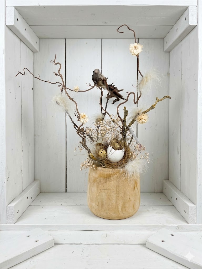 Handgemaakt Paasstuk ‘Spring Nest’ – Natuurlijke Decoratie in Houten Pot