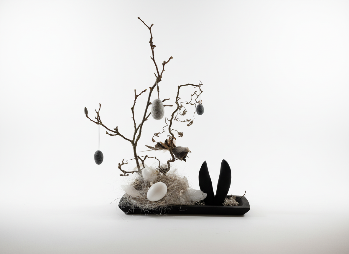Breng de lente in huis met dit unieke paasstukje op een robuust houten dienblad, compleet met een natuurlijke tak en vilten hangers. Het nestje met witte eieren en de moderne zwarte konijnenoren maken dit tot een sfeervol pronkstuk voor op tafel of een kast. Afmeting zwarte schaal:48cm*16cm.